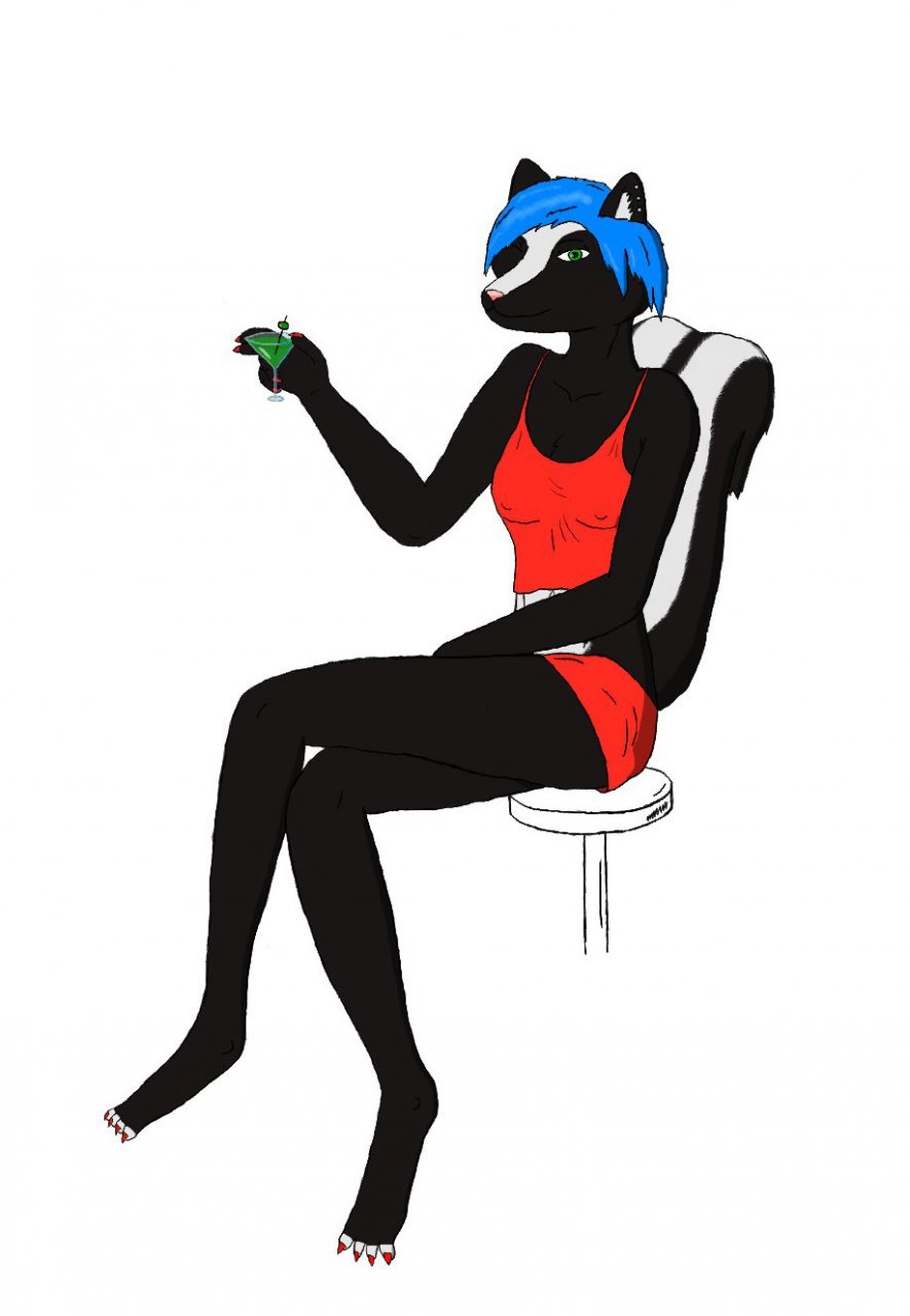 Here is my lovely skunkette Azalia taking a seat and enjoying a nice martini. The stool I left looking plain because I wanted it that way.
