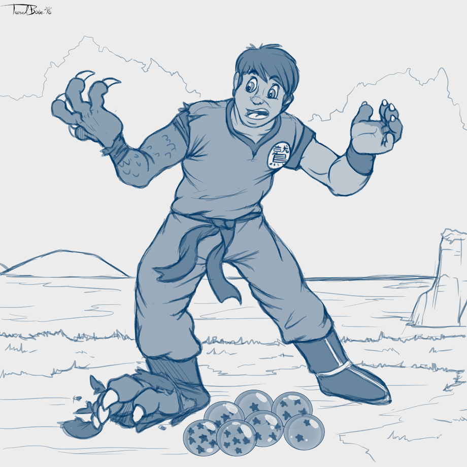 Phil could barely contain his excitement as he placed the last dragon ball at his feet so it could join its six siblings. He had spent over a year tracking down the orbs, and it was finally time for his hard work to pay off. He would be able to get his wish grated by the eternal dragon, making him the richest man on earth. He watched in fascination as the balls began to glow brightly, the sky seeming to darken a bit as the magic within them was activated. Phil looked around for Shenron’s appearance, but he saw nothing. “Maybe it takes a few minutes” he wondered aloud to himself as he looked at the balls, which were continuing to glow on the ground in front of him. Reaching down, he gently poked on of the dragon balls to see if it would do anything. No dragon appeared, and all it did was make his hand feel tingly, so he stood back up and looked around. “What gives!!?” Phil shouted, looking at the sky and scratching his hand, which was suddenly very itchy. Looking down, Phil could see why: his hand was covered in green scales! And his fingers had sprouted white talons where his fingernails should have been. Even as he watched, his fingers swelled and merged, becoming three digits and a stubby thumb. He could only gasp in shock as the scales traveled up his arm, swelling it with muscle, tearing the sleeve of his outfit. In fact, his whole arm seemed to be growing larger, starting to look comically big on his body. That situation was short lived, though, as he heard a loud *POP* - a clawed foot similar to his hand broke free of his shoe, covered in the same green scales. “What’s going on?!” Phil shouted in panic, trying to push the scales off with his other hand. However, this only served to have that hand start changing as well. Small white talons began to form, and his fingers started to merge together into three large fingers.