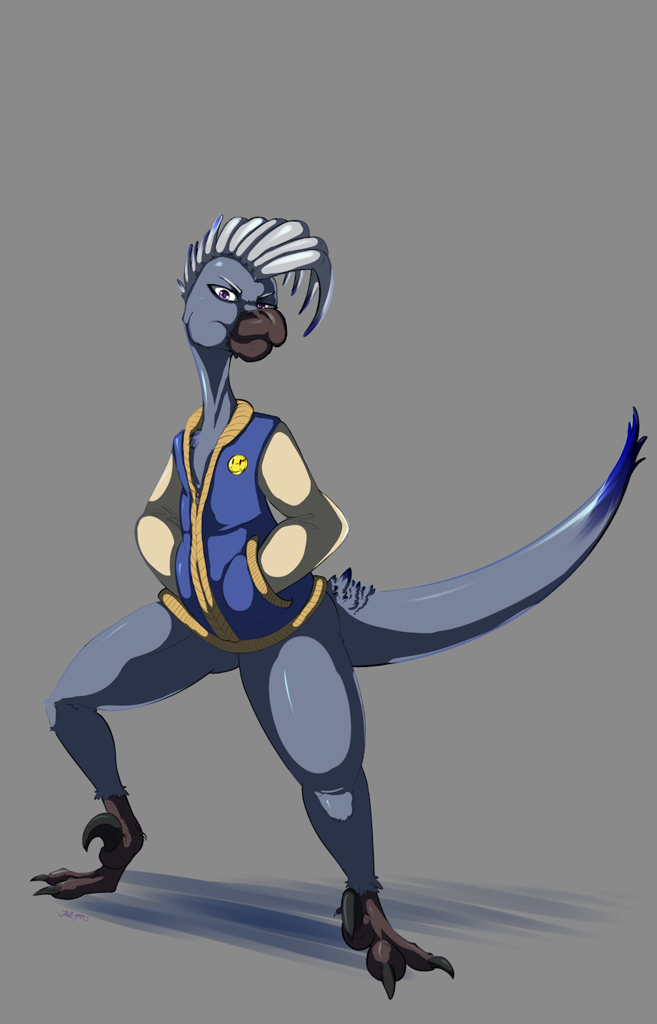 Very cool looking raptor. I like the color. Hands in pockets look fits her well. Feet do look raptor-y. Good head crest and pleasant tail base feathering.