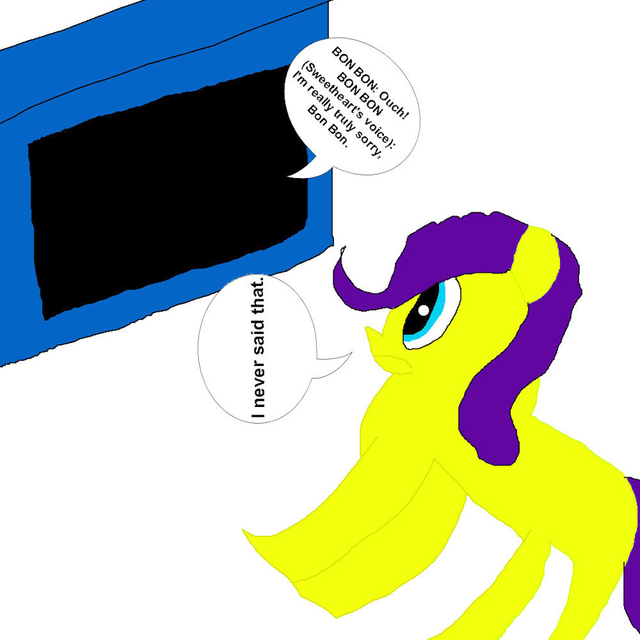 Bon Bon has spotted the error whereby the dialogue is screwed up as shown here and says "I never said that" referring to "I'm really truly sorry Bon Bon" because it's not her voice and she wouldn't have said it when she got hurt. In fact, Sweetheart's voice said it but Sweetheart's lips didn't move.
