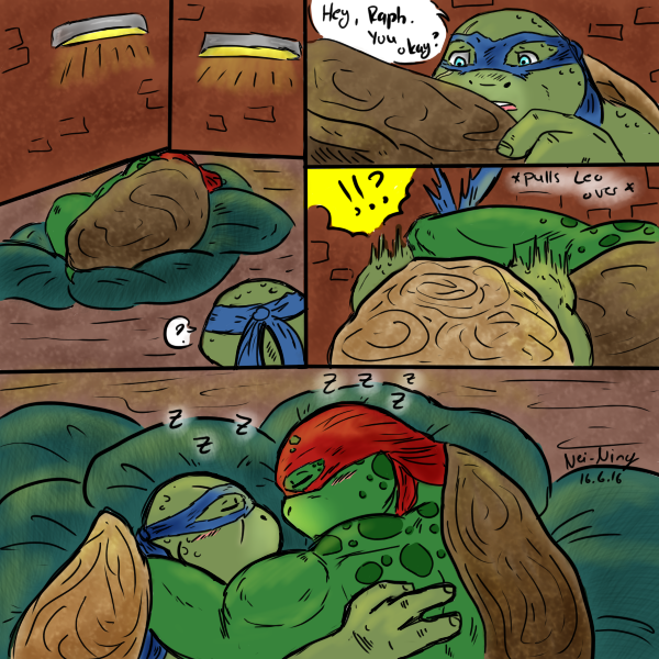 Very cute idea what came in my mind last night. In one corner of the lair is pile of pillows and 2 heat lamps on the wall where turtles and Splinter can warm at times if they feel cold or want to relax some more (since I'm sure there's heaters in their lair anyway). Leo finds Raphael laying down and since Don hasn't introduce those heat lamps to Leo yet, Leo's worried that something's wrong with his little brother. However Raphael's fine and he pulls Leo there next to him who falls asleep pretty soon after he starts to feel nice and warm under the lamps and in Raphael's arms ~ Oh, you can also think this as tcest or just brotherly art. Choice is yours.