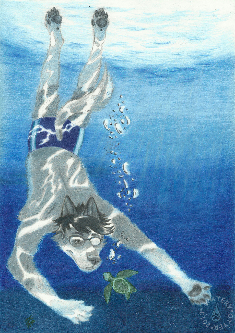 When I still had a small furry mess on my identity, I made this drawing in the picture I like a wolf diving with my little rover goggles and explore the seabed (something that really excites me), and then I find a small sea turtle, which begins to play and to swim next to me.