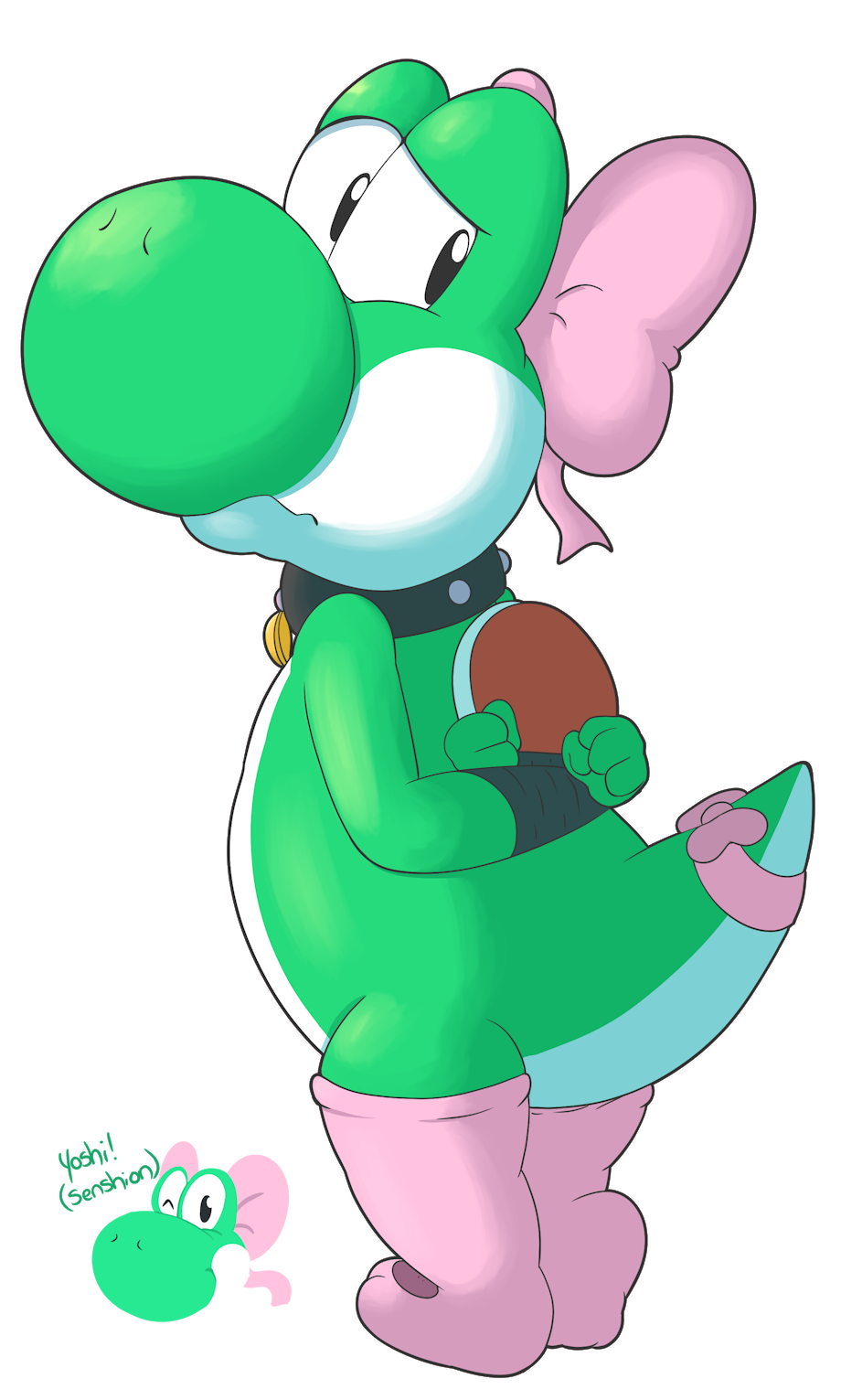 Just a picture of a cute, captured yoshi who is forced to crossdress in front of his captor ;3