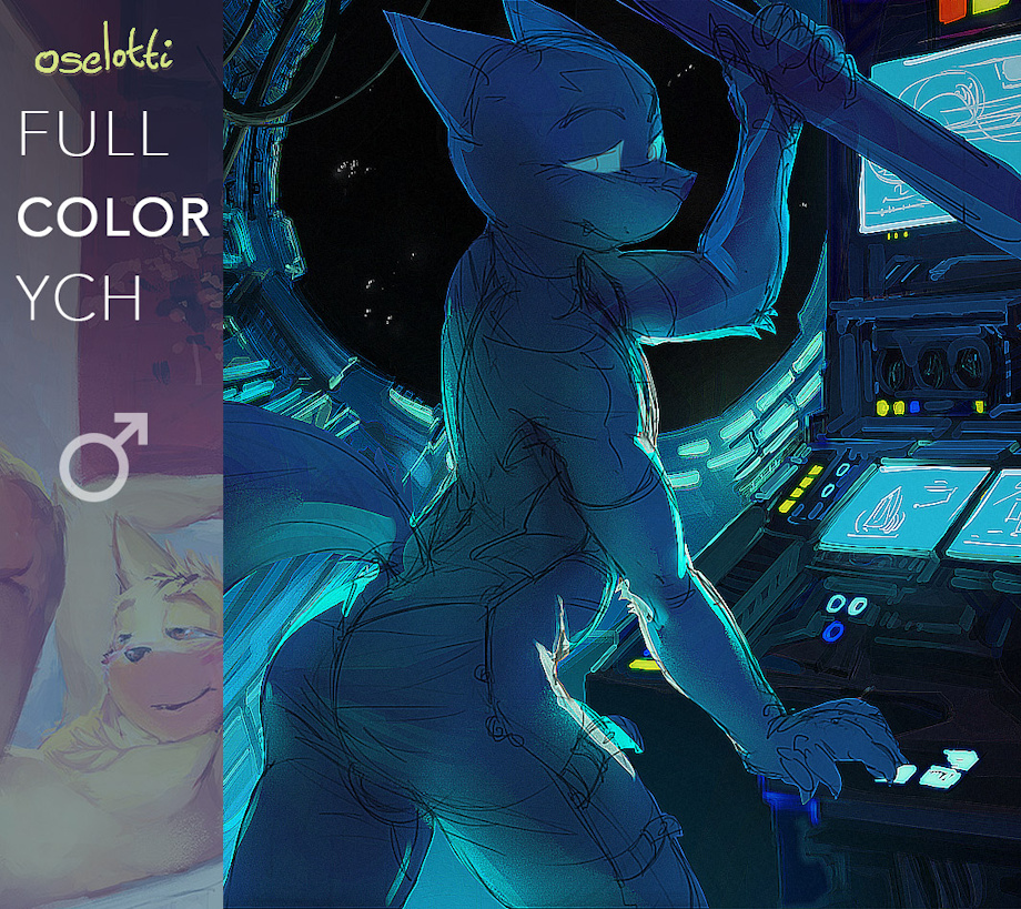 This is my first ych auction, featuring your character with a nice tight suit, some shiny latex or the like, and some sci-fi lights :P