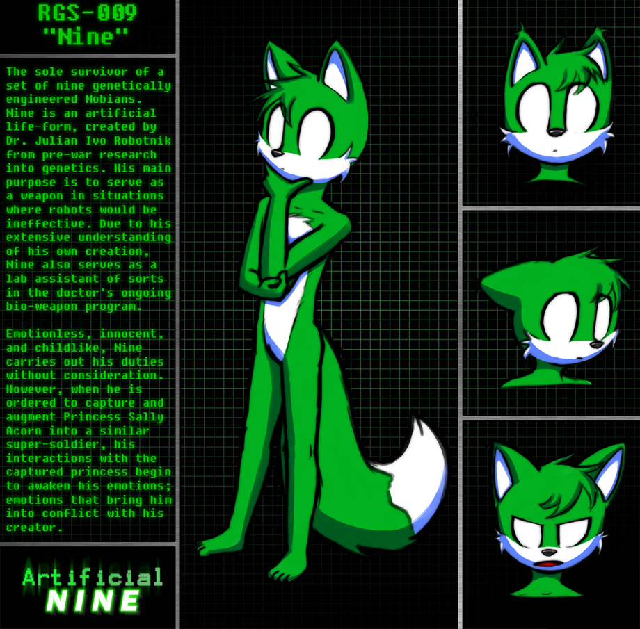 He kinda looks like Tails with only one tail and his fur dyed green. Now that I think about it, Nine apparently has a thing for Sally, just like Tails...