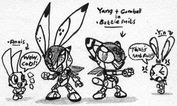 This is just a random picture of Yang & Gumball wearing special battlesuits made from the same alien-tech as Jamiko's armor. Much to the amazment of Anais, and the dismay of Yin.
