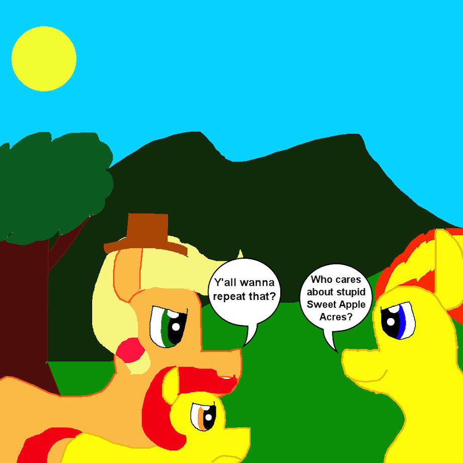 Apple Bloom and Applejack don't like Smokey Flame dissing their property.