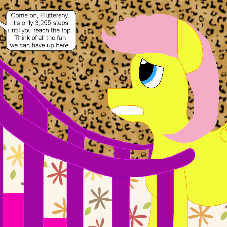 Fluttershy isn't thrilled about climbing the stairs and Pinkie Pie only makes things worse.