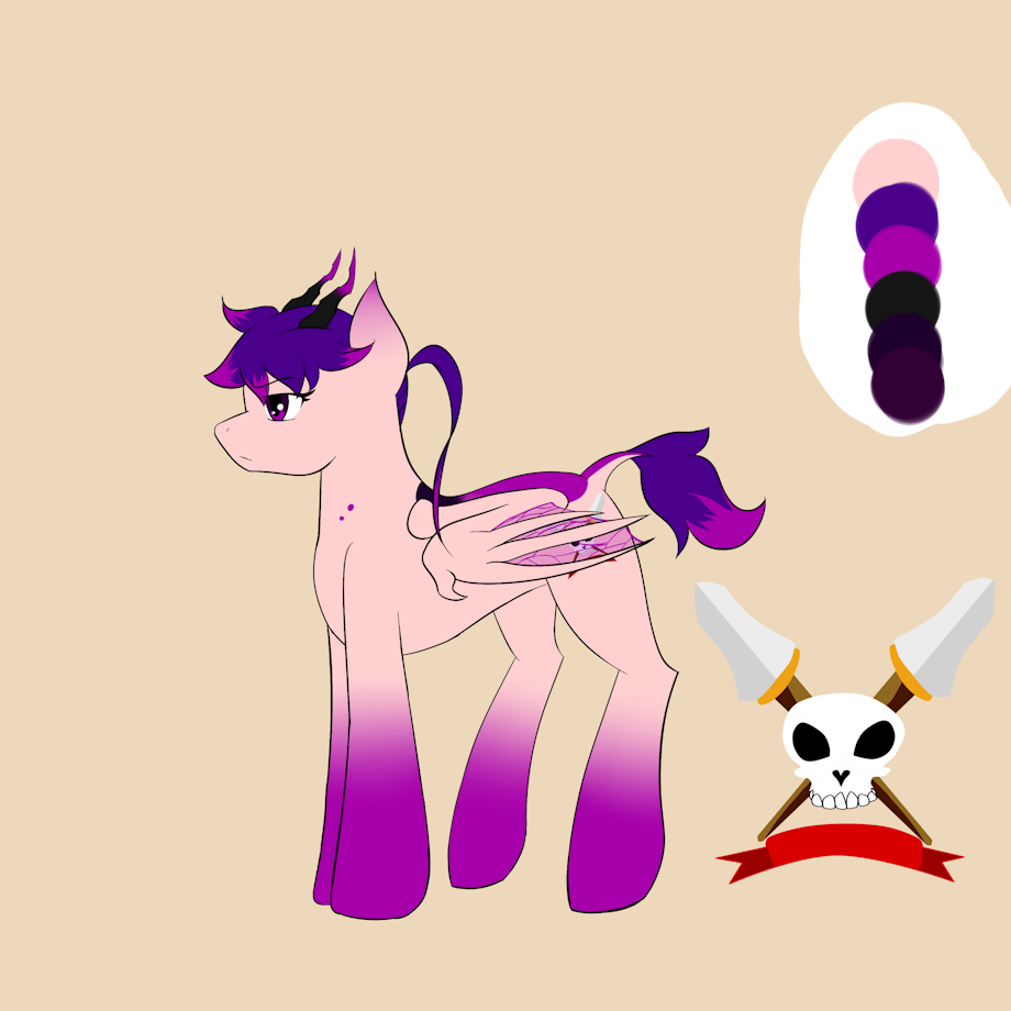 Nerio is a pale red that looks similar to pink, due to her Changeling blood line she has a distinct purple gradient patch on his back where normally you'd find the Changeling shell like the rest of her siblings. Her hooves and the tips of his ears also fade from purple back into her pale red coat, her mane is nicely kept as she pulls the rest of her mane back into a ponytail though having a few cowlicks in the front resembling her father's slightly and the edges of both her mane and tail are covered in natural purple highlights which she inherited the highlight effect from her Demon grandmother, the various purple areas around her body are a mixture of coat colors from the genes coming from both her mother and grandmother to form the purple you see on her coat. she derived her bat wings from her father but with a twist, her changeling genes from her mother replaced the skin between the wings fingers with an insect-like membrane that reflects the purple color of his magic aura just like her other siblings. Her tail is mostly hairless sporting a small amount of hair on the end, again derived from her changeling roots corresponding to her Changeling genes she sports a pair of fangs. Lastly from both her Demon, Alicorn and Changeling roots she has two horns tipped in purple and filled with sharp grooves that curve inwards, she generates her magic between them where she would proceed to do any spell that any normal pony would.