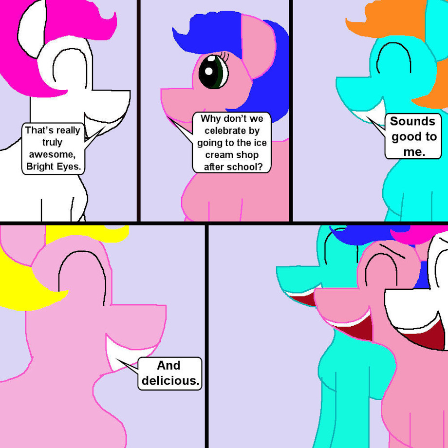 To celebrate Bright Eyes' return, the ponies agree to visit the ice cream shop after school and have a good laugh.