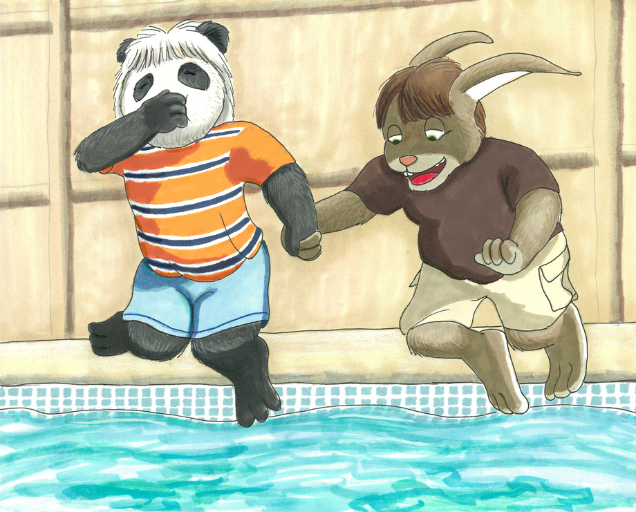 Commission for Rourkie of his character, Lance (the bunny), jumping into the pool with his buddy Caleb, the panda. Caleb's kinda reluctant to jump off the side, you see. ^^