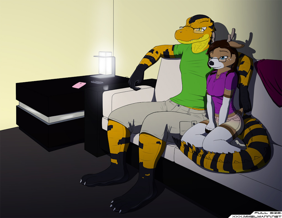 Sev got his new fursona as an adoptable, and then Mel developed a new deer fursona to replace her bat, and so I got to draw both their new forms cuddling together and watching Princess Bride.
