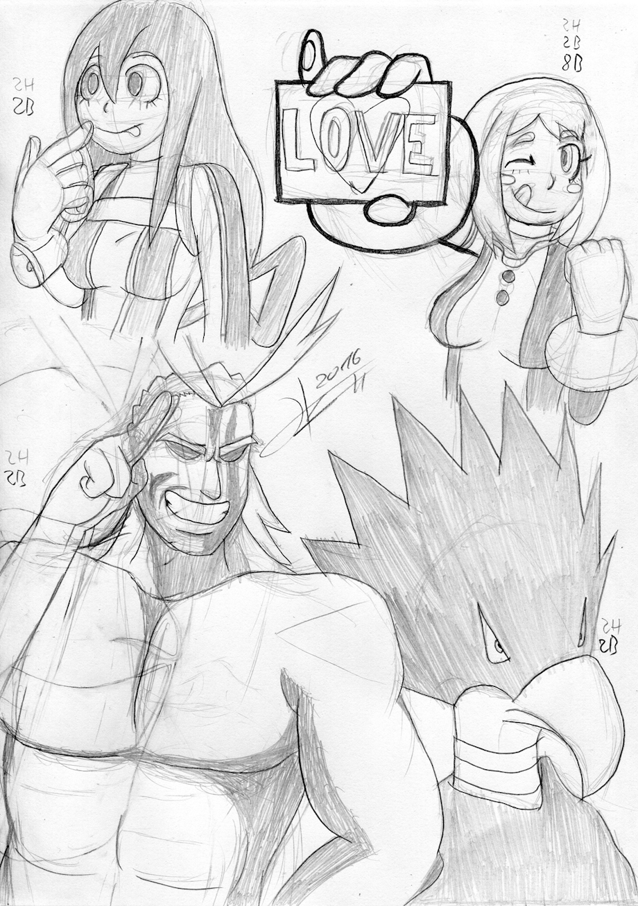 Practicing anime/manga. Asui Tsuyu, Uraraka Ochako, All Might and Fumikage Tokoyami, all the new serie Boku no Hero Academia, full of cool and cute characters.