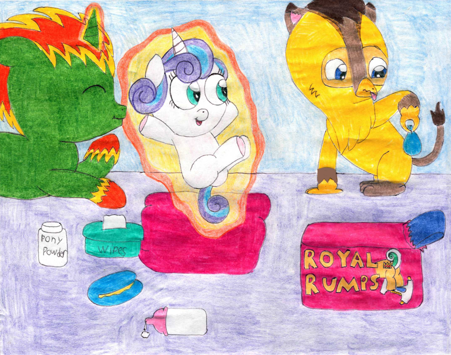 It would seem that as both Blaze and Divine were tasked to Babysit Blaze's niece, Flurry Heart, diaper changes were to ensue. Blaze took this as an opportunity to help teach his friend how to change a diaper so that he can be ready to do so the time he has little Gryph-lings. Divine doesn't seem to like this part of Babysitting however XD