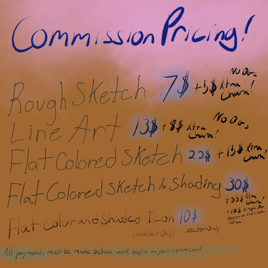 Heyyy what's up you guys, I see you've found my commissions info page! Here you can find all of your basic information on how commissioning me to draw your idea works and how much it costs, as well as examples for what qaulity you could get. I hope it proves helpful and easy to understand. If you have any questions regarding it please feel free to PM me with your concerns! I hope you might consider commissioning me for artwork in the future! (To be honest I'm a little scared actually opening my doors for you guys, but I'd like to hear what you have or want me to draw and I could use a little extra cash for my own commissions lol!) Well thanks a bunch for viewing, I greatly appreciate your time! Have an awesome day! XD ————————————————————————————————————————— Just in case my chicken scratch is too poor and illegible I'll put the prices here in text format. ---------- Prices 7$ Rough Sketch +5$ Additioanl Character Free White Plain Background 13 Line Art + 8$ Additioanl Character Free Static Color or Vector 22$ Flat Colors + 15$ Additioanl Character + Opetional 10$ for Complex Backgorund or Free Static Color or Vector 30$ Flat Colors with Shading + 20$ Additioanl Character + Opetional 15$ for Complex Backgorund or Free Static Color or Vector 10$ Flat Colors with Shading Icon (HeadShot Only) Free Static Color or Vector ------ Note: If you're interested but something seems to high, we can probably negotiate the finale price tag, also you should know the price for simple and complex backgrounds various it depends on what you ask for, okay!