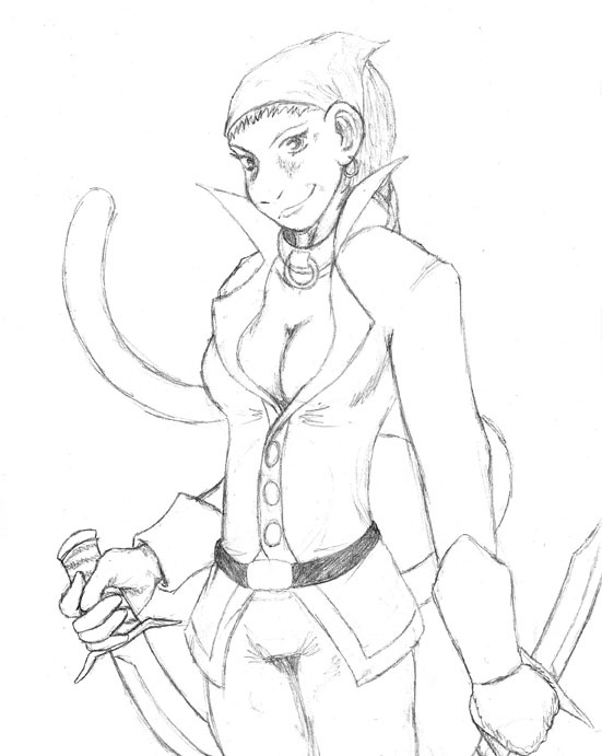 Second sketch, Molly, Lafitte's pet monkey person. Not shown here but, yes, she is a herm of sorts. Or a shemale or whatever you want to say. Technically, hijras. Showing her basic outfit and knives.