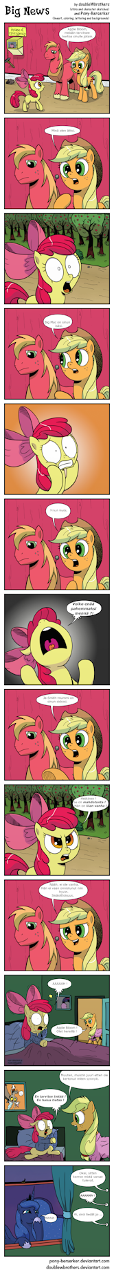 A Finnish translation of http://pony-berserker.deviantart.com/art/Big-News-3849... in more or less standard Finnish. Since he demands publishing even translations outside DeviantArt, it's here. If you ask me, he seems highly egotistical.