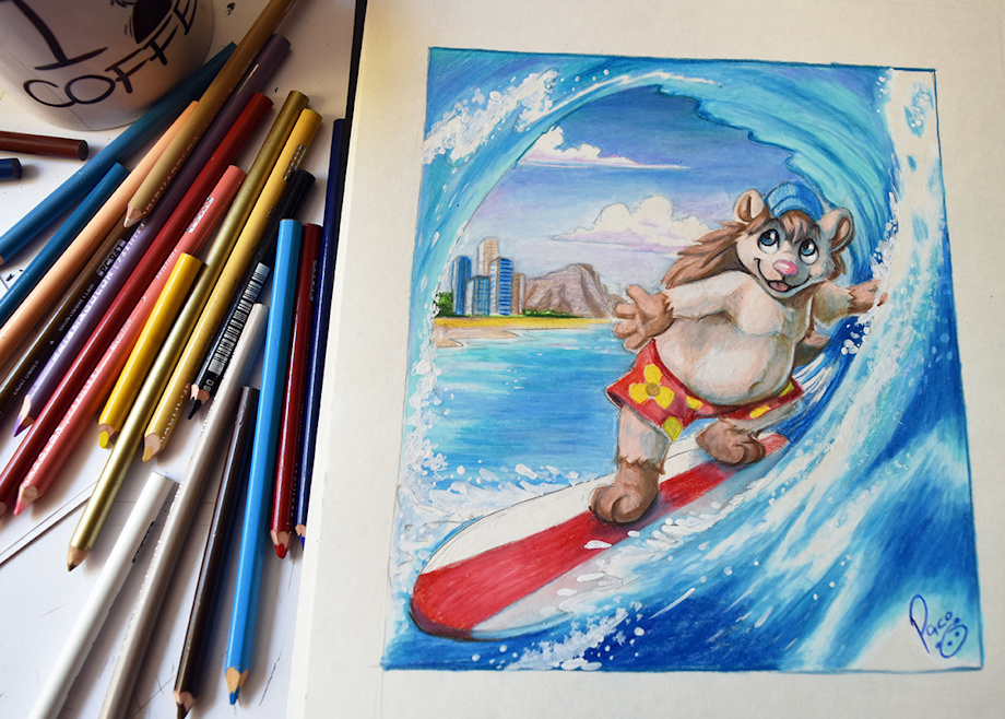 This pic was done with color pencils, which is my favorite technique ever for traditional art. The foam of water was done with white acrylic.