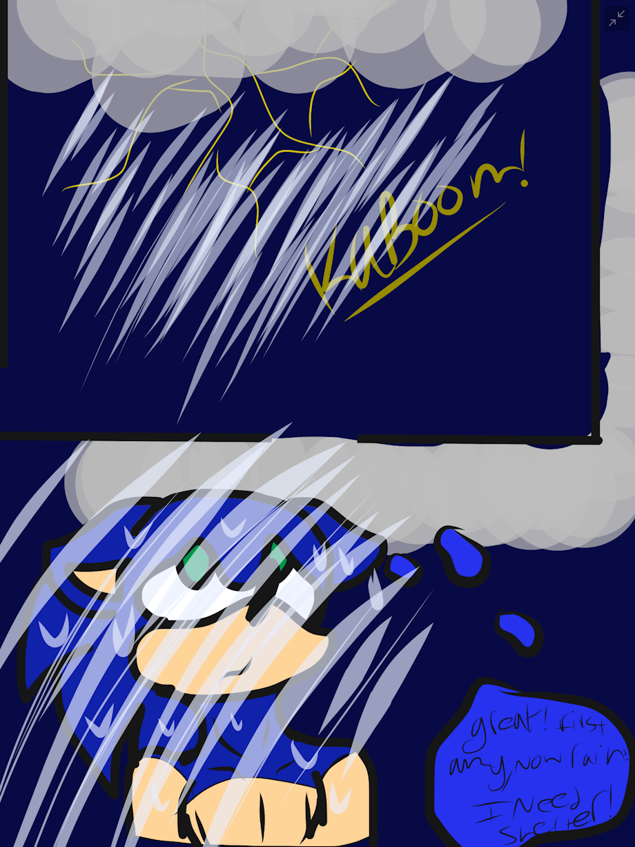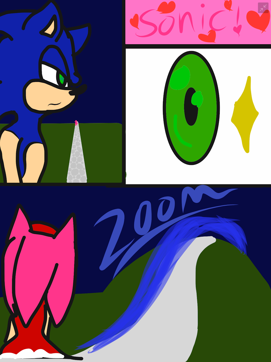 Ok here's my idea for the next few pages: Sonic runs deep into a forest, and as he's running it starts to rain. Then Sonic is trying to find a place to not only hide from Amy but to wait out the rain at the same time. He's about to give-up his search when he finds a shack with the lights on inside. He goes up to the front door and knocks a number of times, when the home owner opens the door Sonic sees that Shadow owns the house.
