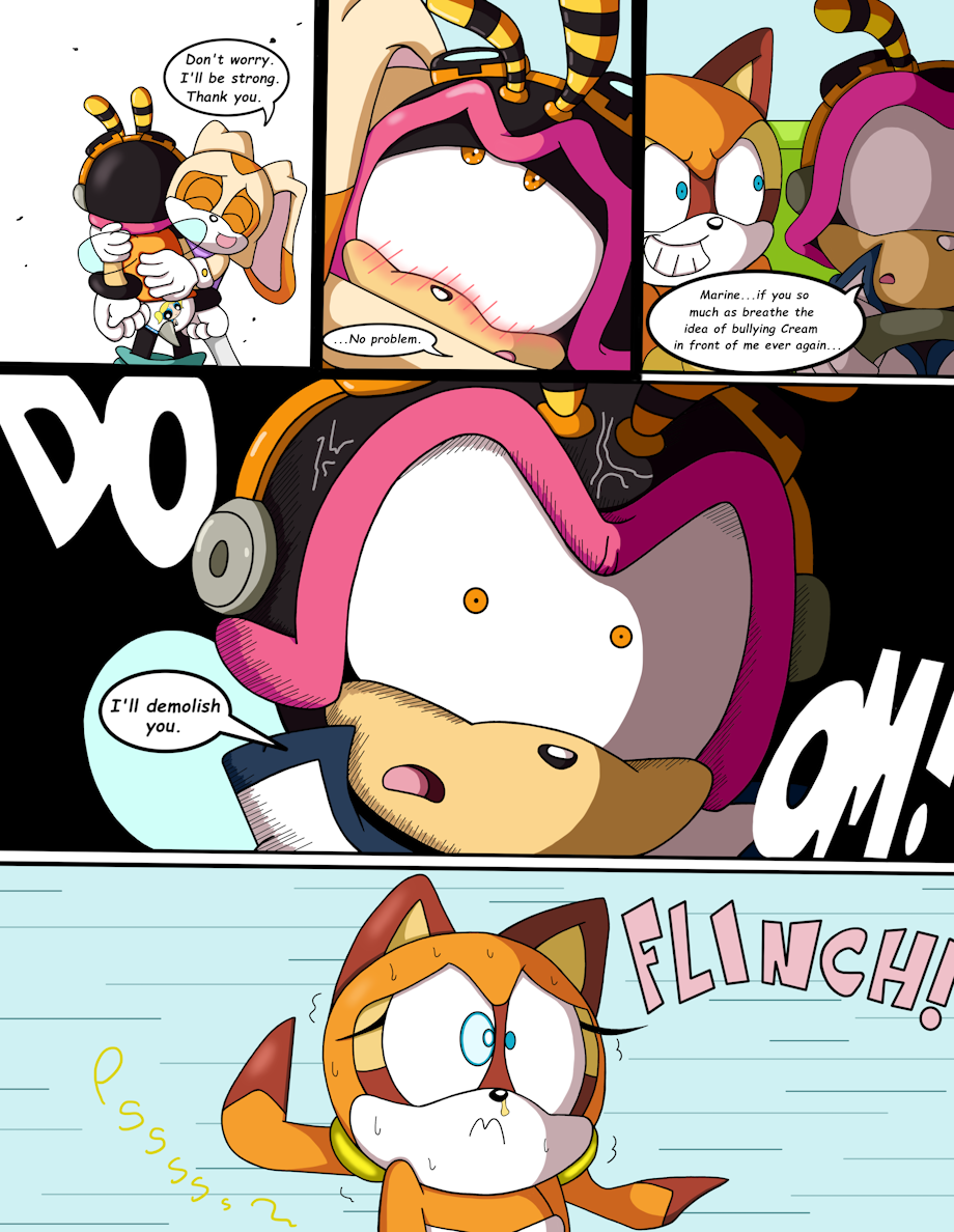 Charmy and Marine got a little behind due to Charmy's diverted attention. However, he has an idea to make up for that. He decides to use Marine's clothes as a lasso to snag the enemy kart. Of course, they're spotted immediately and Espio gets up to try and cut the makeshift rope away. However, Wave decides now is the time to use their last resort. She's determined to win using only what's been built within the kart. She fires it up while holding onto Espio's pants. In doing so, she manages to keep Espio's pants in the kart...