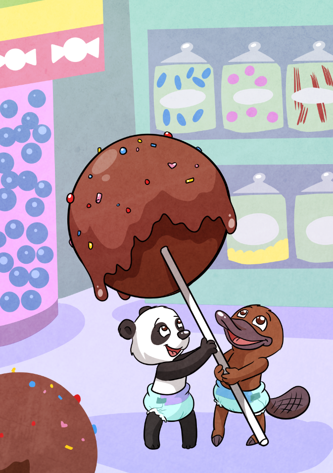 Izzy the Panda and Benny the platypus went to zootopia’s best elephant candy shop. They put their allowance to a giant sized cakepop, which they will greatly enjoy