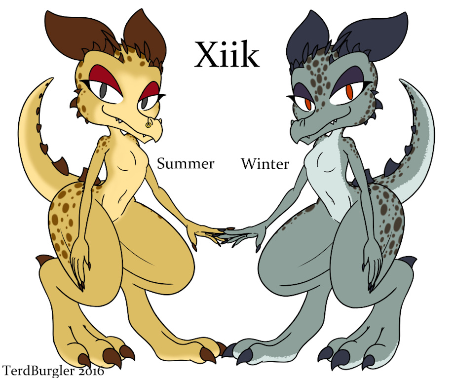 Standing at just 3′0, Xiik is a pretty petite little kobold. Her scale pattern shifts based on the seasons, transitioning from sandy with rust-colored spots in the summer to swampy with mud-colored spots in the winter. Being a reptile, she has no visible nipples.