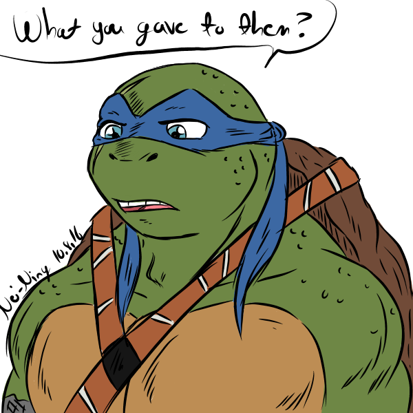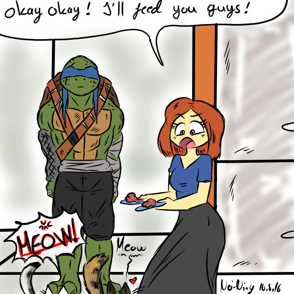 Something what happened last night / this morning at 6am when I fed my cats (Minna, girl cat is the one who makes angry "MEOW!" since she meows in very angry and demanding way when she wants food xD Verti, dark, is my boy who meows a lot more gently). Leonardo was with me in the kitchen and he was curious, in his cold way, about what I gave to my cats so I gave him my answer and we actually, after this conversation, ended up laughing and joking around about cats food, fishes and what turtles eat x) It was adorable to see and hear Leo laugh and smile <3 (That's why I adore him so much in the last panel! >//u//< )