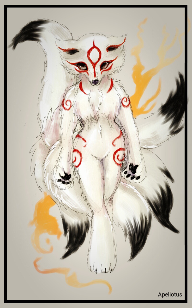 I just wanted to draw a 'dough legged' character just for fun. Not really sure what I wanted, first I ended up drawing a curvy fox but as I refined it I was inspired by the Okami game's style. This was just an experimental piece but I like it. My favorite part to draw was the eyes.