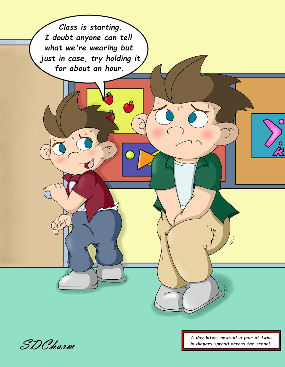Two characters from Kim Possible, a show about a teenage girl who fights crime. The younger brothers of the main character, Kim, are a pair of twins. They're Jim and Tim and they were extremely easy to mix up when you were a kid. Something happened with the possibilities being that one of Kim's villains got to them in a bad way, or one of their inventions went wrong, or they just fell down some stairs. How they ended up like this matters little, because they're stuck like this anyway. Jim's gotta use the potty but Tim is trying to keep him composed as best he can because they need to head to class. If he ends up going in class with that thing on his person, no doubt people will hear it (and smell it later too). All he has to do is hold it for an hour. After all, it's not totally obvious what's under their pants at all. The diaper boys are truly hidden in plain sight.