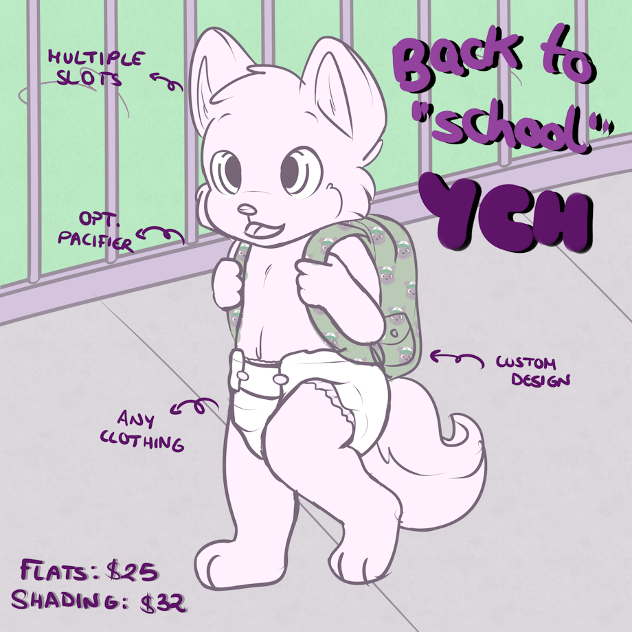 Info - Multiple slots YCH. Any gender and species accepted. - Payment should be made upfront via paypal. - Background will remain as it is. - Clothing can be changed! You can add a shirt and a pair of jeans for example. - The design of the backpack is totally customisable - Right now it's based on Rocky (Paw patrol) but you can choose your favorite character of any cartoon, yay! - A slot with flat colours is $25usd. - A slot with shadings and highlights is $32usd