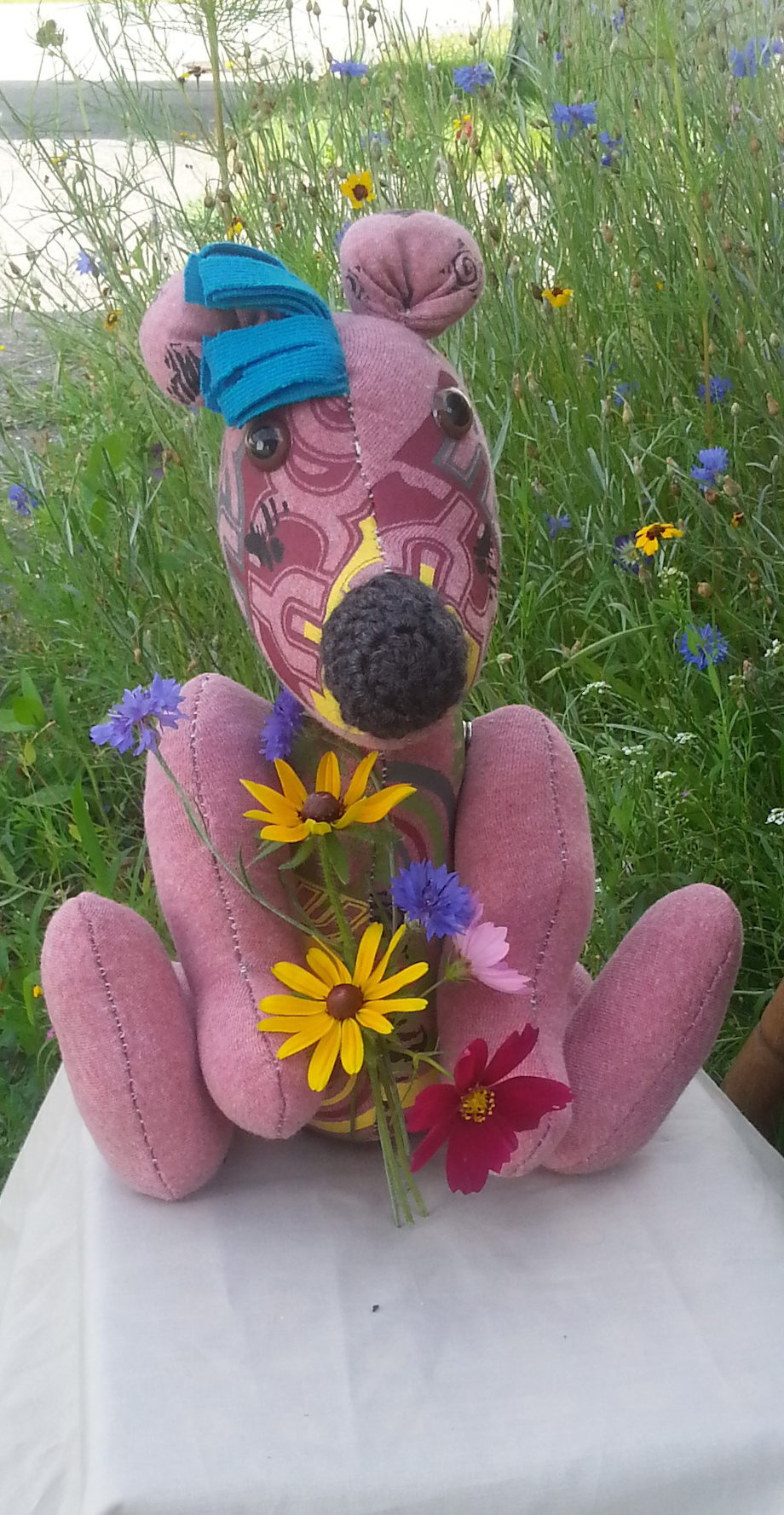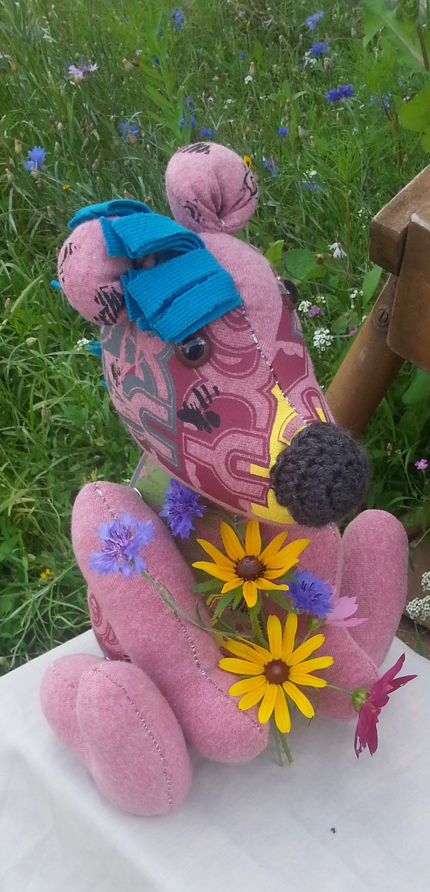 This little pink mohawk bear was made out of a Roxy kid sweater that I found in a yard sale, he also has detachable lives.