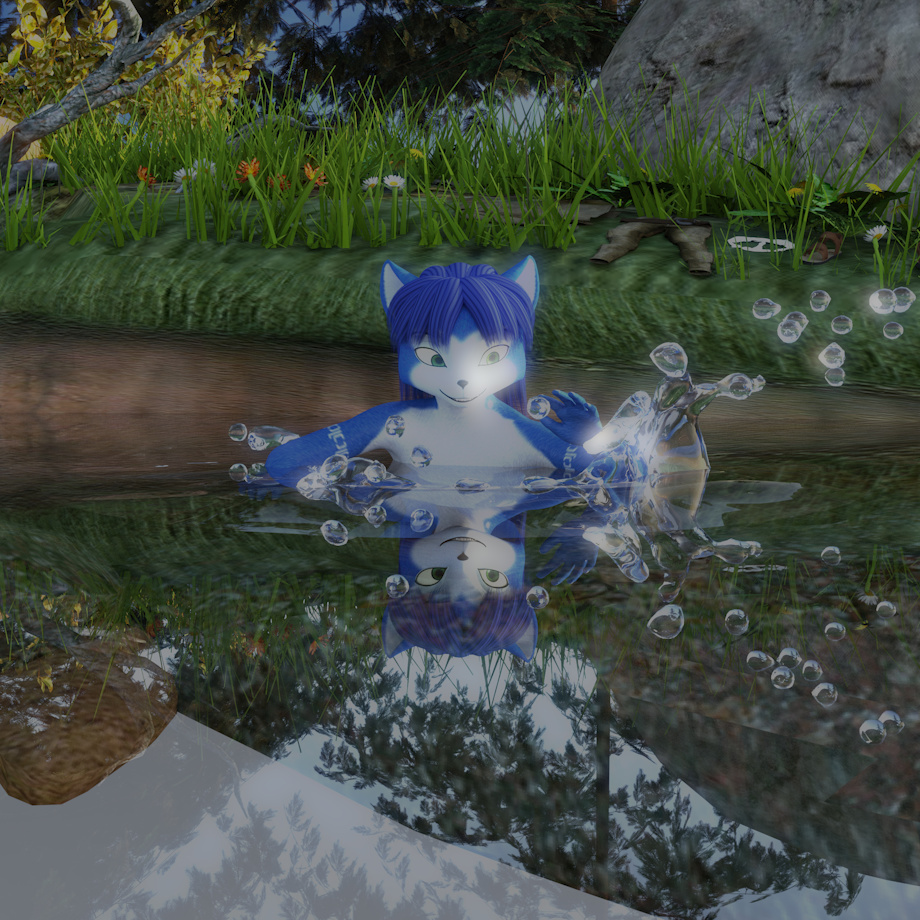 Out from the bushes came a fox, a young kit who's fur was as blue as the water, with a white belly and tattoo like markings on her arms and thighs. Krystal was her name, a young energetic girl who was in the midst of returning home after a growling training session for her future as a warrior of her tribe. A truly honorable position for her. At this time she was on her way home through the forest to meet up with her mother and father, to forge her very own staff, the weapon of choice for her family along with intense martial arts. Should proved herself that day, having shown a strength and determination the likes of which her mother had in her own youth. To say her parents were proud would be an understatement. The little fox's smile only grew when she was told to take it easy for a while, to rest until it was time for her to gain her weapon, and she chose that time to walk along the river heading towards the lake her village rested near, her ears taking in the gentle trickle of the water as she walks. She stops and stretches with a yawn, her muscles aching from the intense workout her mother put her through, and her fur matted in sweat and her clothes dirty from being tossed to the ground during training, all in all a good day for her.