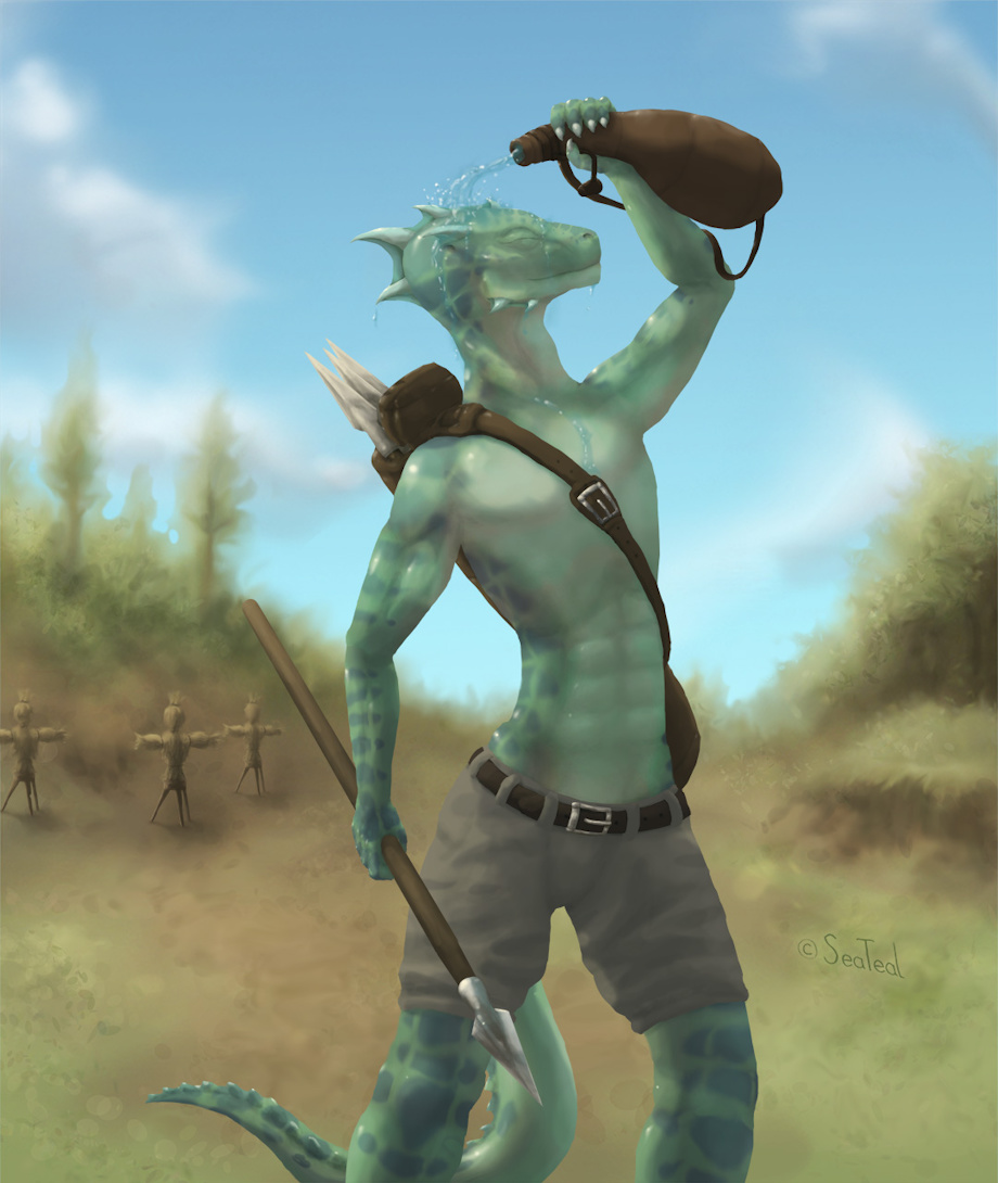 This argonian makes sure to hydrate himself while practicing on this sunny day.