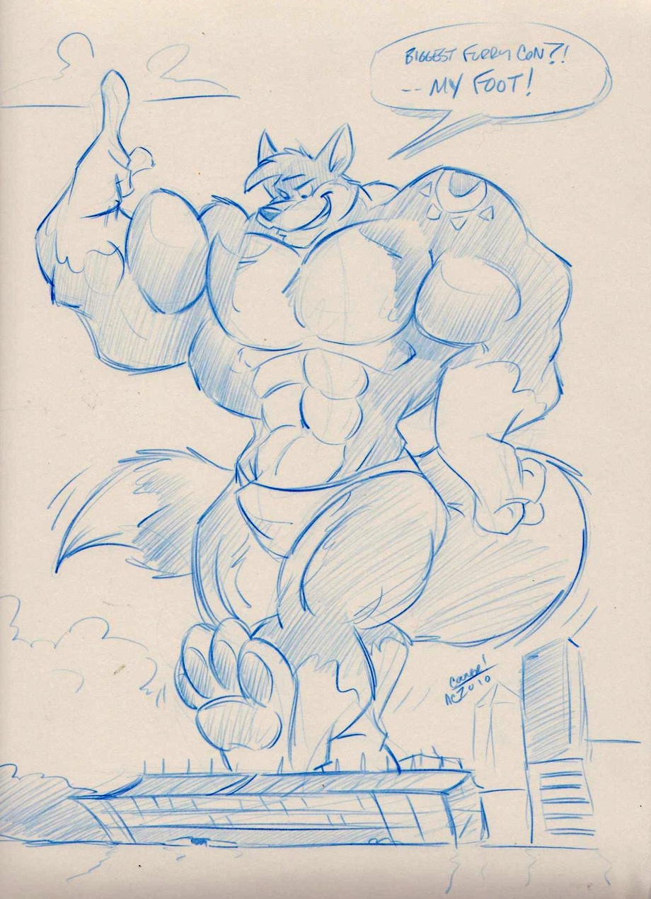 This is a scenario of what could have happened: Despite coming to the largest Fur Con in America, Nik the Foxwolf suddenly becomes a big buff colossus; unfortunately, he couldn't get inside the con and now, unimpressed with the convention center from his birds eye view, places a paw to the center. Many furs and non-furs shriek in horror...others...well, they take pics and try to climb on. Sigh...furries. XD