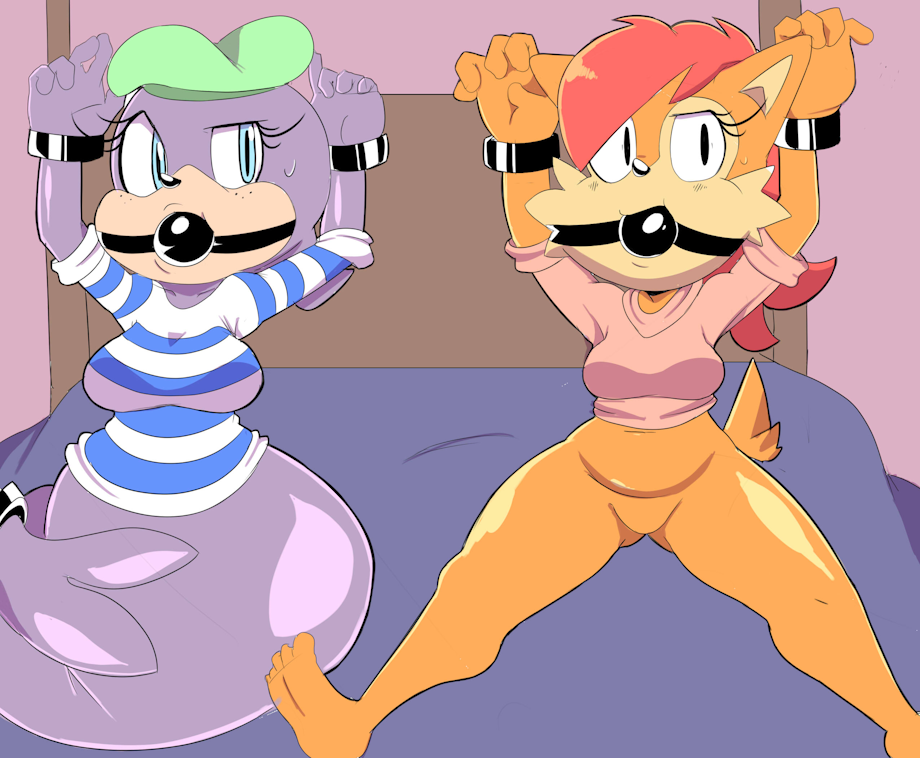 Two of my favorite characters from the Sonic the Hedgehog comic book by Archie Comics, now presumably losts to the mists of history: Erma Ermine and Sealia Seal, abducted, chained to a bedpost and ballgagged. I'll leave it to your imagination as to the other specifics.