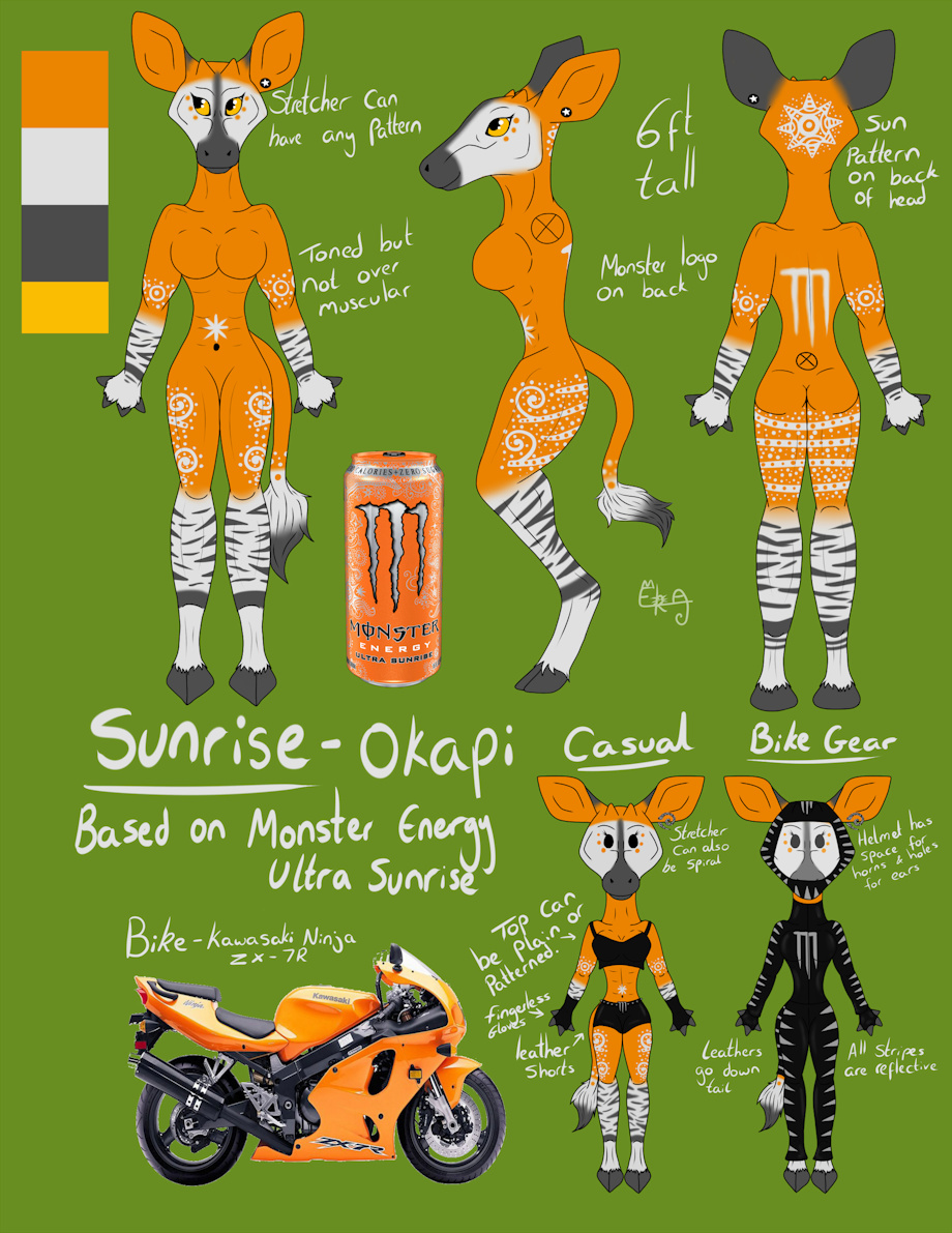 I SWEAR THIS WILL BE THE LAST CHARACTER I MAKE FOR A WHILE!!! I couldn't help it XD When i get the idea in my head i just have to create it. This was mainly inspired by my new found love for Monster energy's ultra sunrise drink a long with the fact when i last went to the zoo i was able to get so close to their Okapi (it was right by the bars) and i had never been able to appreciate the species in such detail before. All of her markings are inspired by the pretty patterns on the can, they may be a bit complicated but their pretty ^^