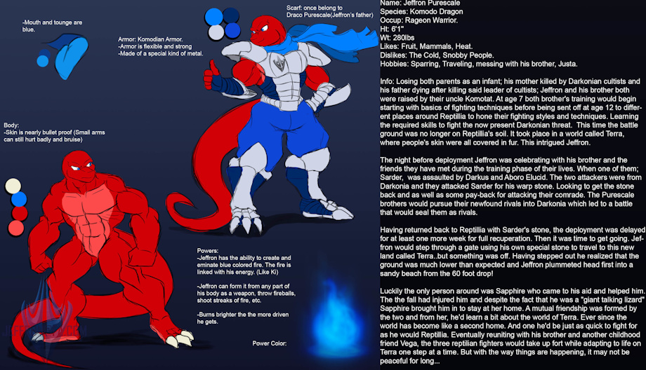 Name: Jeffron Purescale Species: Komodo Dragon Occup: Rageon Warrior. Ht: 6'1'' Wt: 280lbs Likes: Fruit, Mammals, Heat. Dislikes: The Cold, Snobby People. Hobbies: Sparring, Traveling, messing with his brother, Justa.
