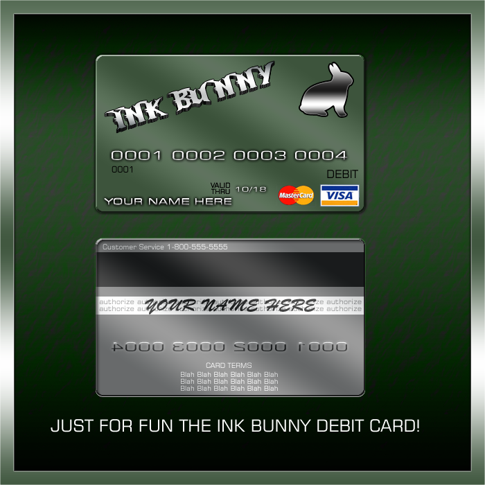 "Fiction Just For Fun" And just for IB the "Ink Bunny / Debit - Credit Card" Just got done moving into my new place, and been working on a recolor for a fellow artist here. Which is doing very well :3 Don't worry will be done soon ASAP.