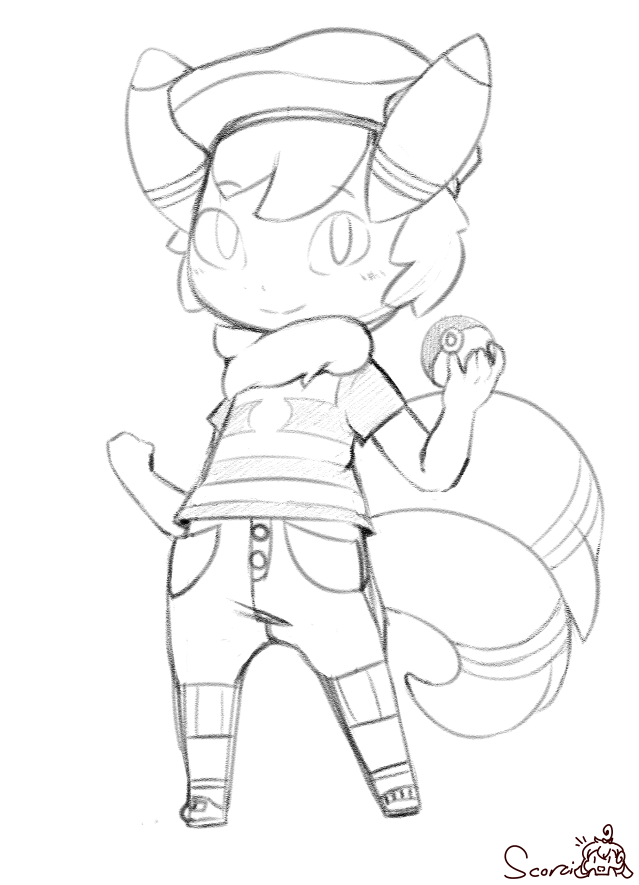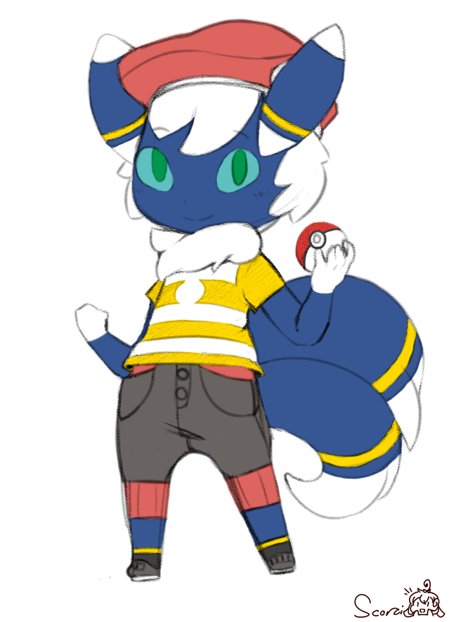 Milo's clothing is almost entirely stolen from human society, the hat was stolen from a Pokemon trainer when he had dropped it, the shirt and pants stolen from a human clothing store, and the shoes and socks from a store that specializes in plush toys (thank goodness his paws are very small or they'd be a pain to wear).