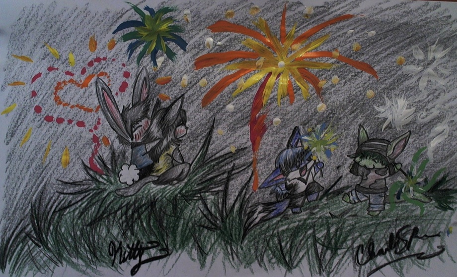 A picture featuring my mate and I along with Primee, the green cat, and Samman, the blue fox. Primee and Samman are not my characters, but characters of friends of mine.