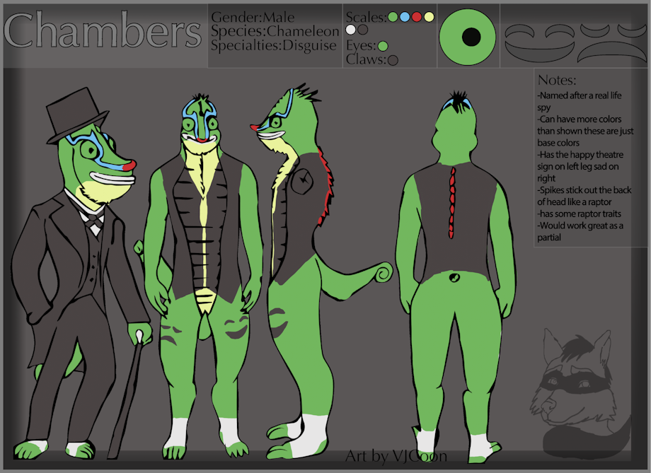 Ended up deciding to post a few more than just one ref a day. This was one of the most rushed refs I did and I think I'm going to go back and redesign him. He's the disguise expert of the team and one cool thing about him is he's actually named after a real spy disguise expert.