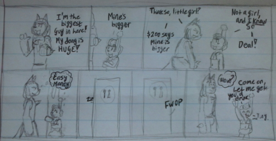 A dumb quick comic with a lucaruo who is overconfident with the size of his bits getting caught off guard by the little hermaohrodite buneary who can grow hers to the size of an airplane hangar. Anyways, she makes 200 dollars using her powers. How big did she make it behind the door? Only a few feet of length so it'll FWOP on to the floor. She didn't want to crush him. Now he is wondering how she hides ALL THAT, in her fluff.
