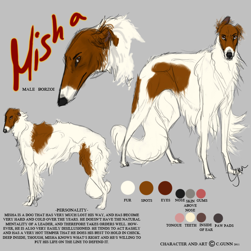 Oh Misha, how I love thee! He's becoming one of my oldest, longest running charcters. He has two sculptures, too. x) When I draw borzoi, I generally draw him because, he's MISHA! And his old ref was SO OLD. It was from the end of '08 and yikes. He needed a new one. I think I'll probably add another pose to the reference, because it doesn't show the right side markings that good... but I know what his markings look like so I'm okay for now. x)