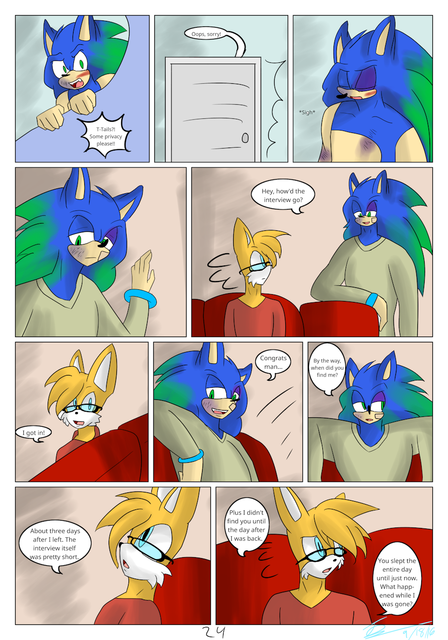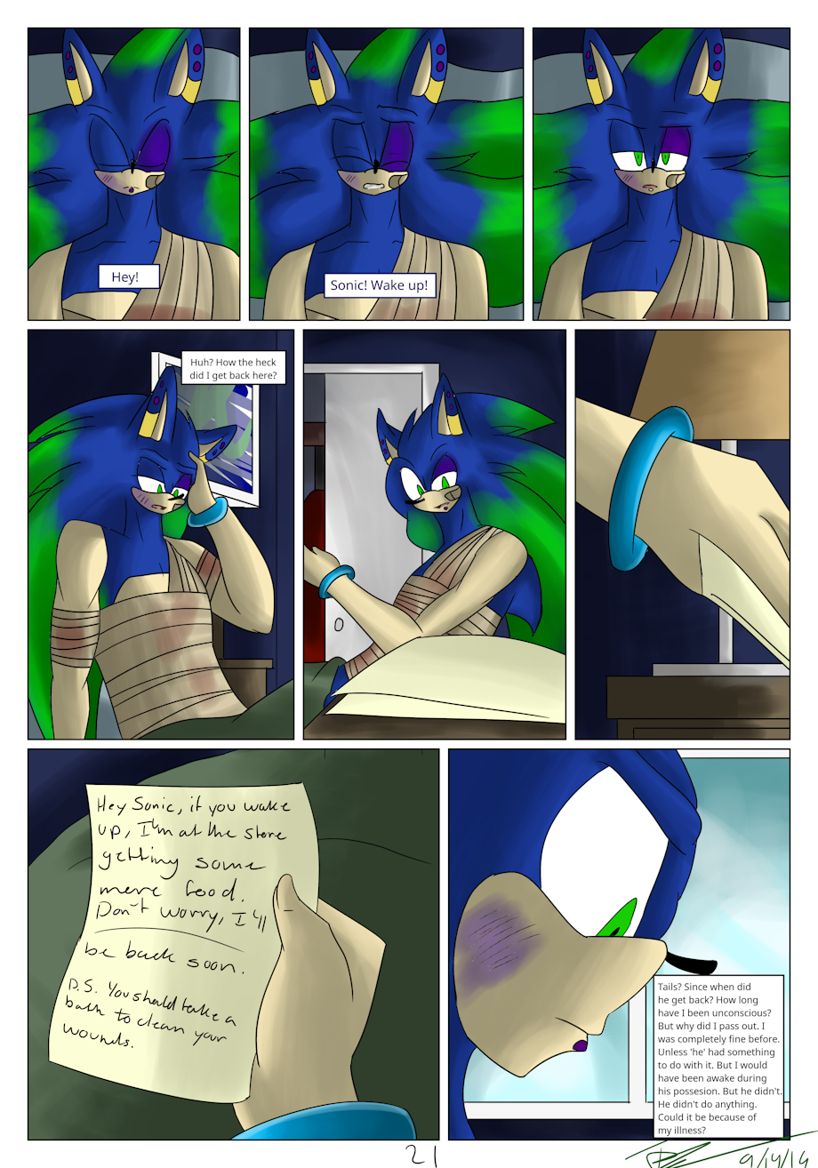 Looks like Tails managed to bring Sonic home safe and sound to take care of his wounds. >u< Though, I do wonder just what kind of illness Sonic is talking about.