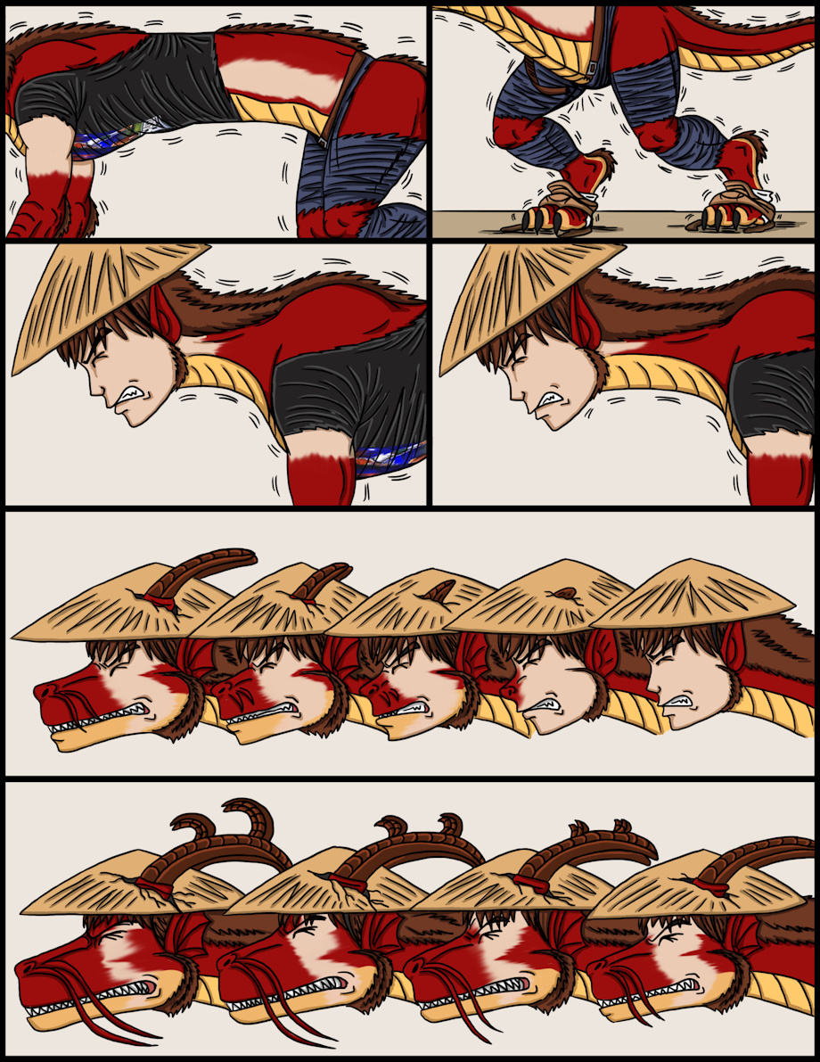 A tail grows from his backside, tearing his jeans, and his neck lengthens, destroying his favorite shirt!