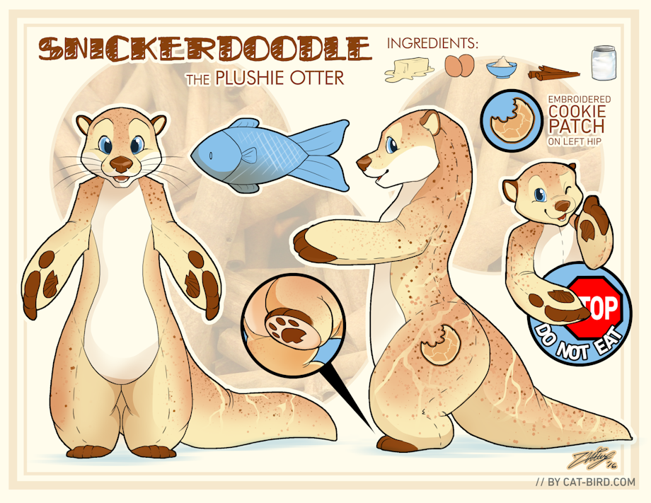 Plush otter that resembles the cookie of his namesake, the snicker doodle. He is 5'7", squishy and very huggable. His paws have scallop shell pattern on him, and his left his has a cookie patch sown on. He smells of cinnamon and sugar and many other delicious things.