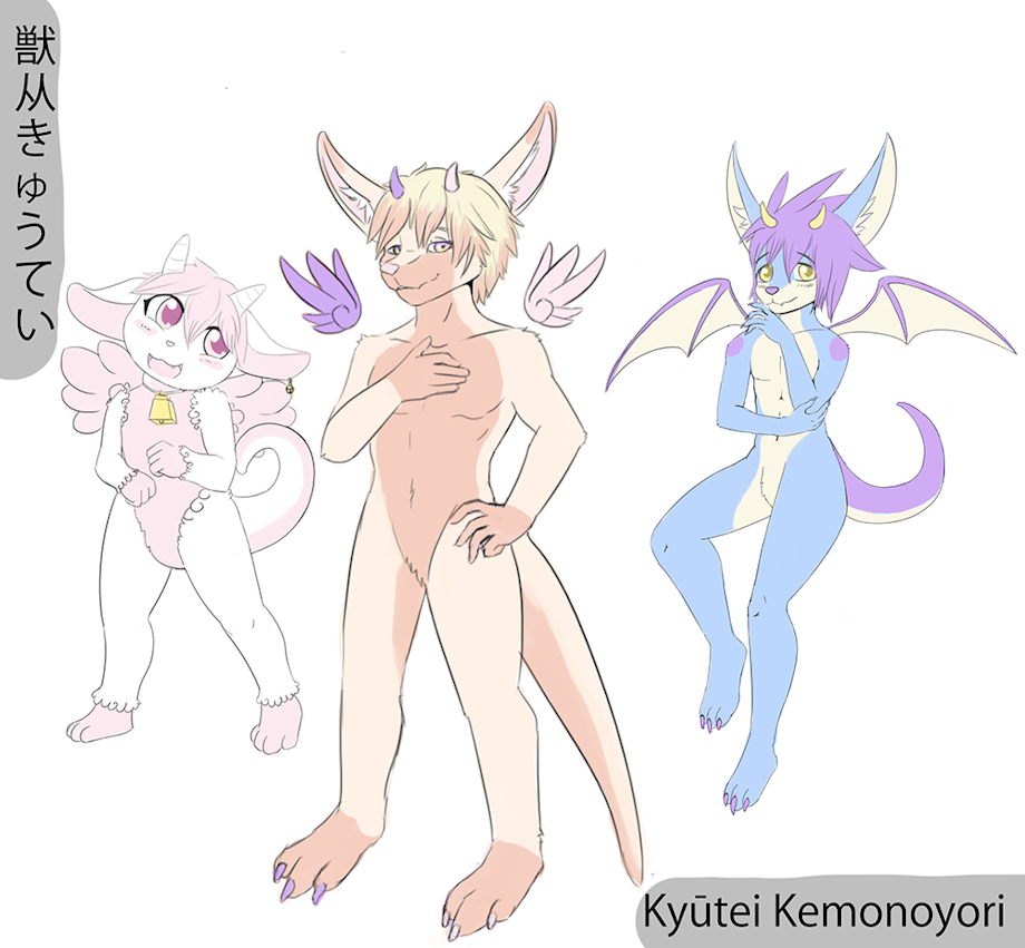 Kyūtei Kemonoyori is a Yokai who took in two banished beings. A fallen angel who was cast out for her mischievous ways (Kyū) and a risen demon (Tei) who was too kind to stay in his dimension of demons.
