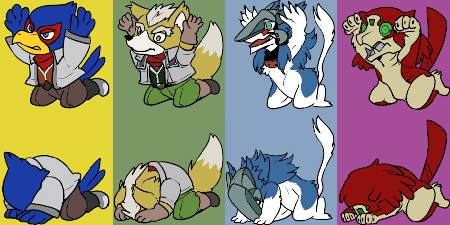 The characters are Falco Lombardi, Fox McCloud, Echidna Luik, and Lingo Cinnamon. (from left to right)