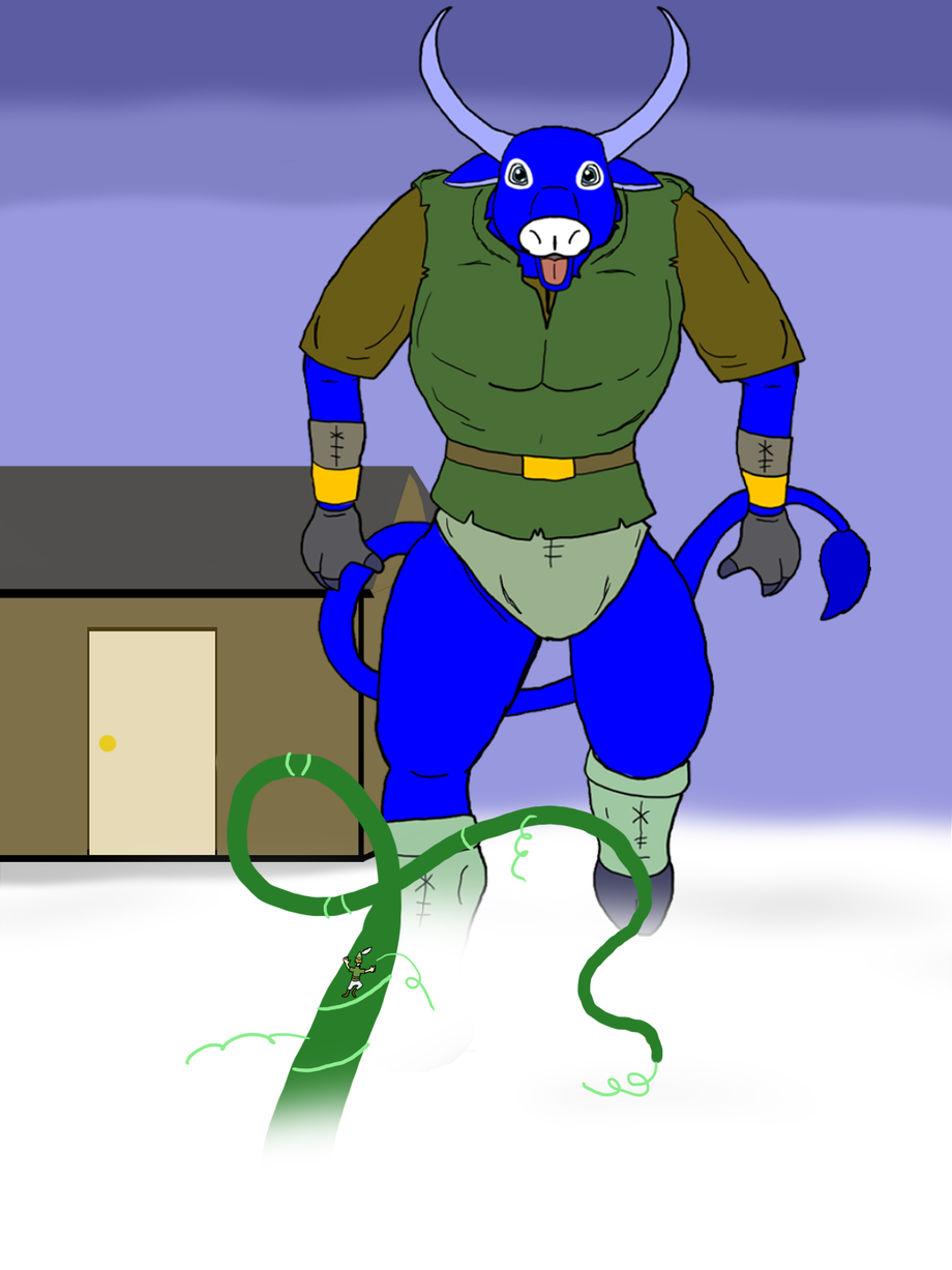 Buck, in Yak form, stomps off toward a beanstalk in the distance, all the while a tiny visitor sees the beast and begins climbing back down.