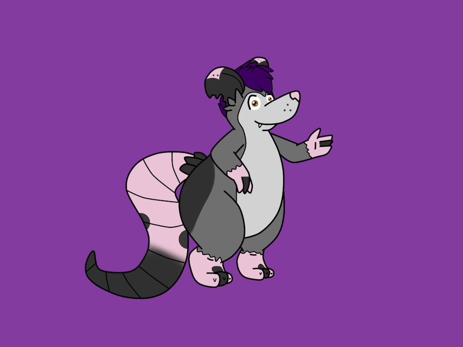 My first drawing of my Fursona, he's a chubby possum who loves making people happy and eating junk food, he also likes belly rubs >w<